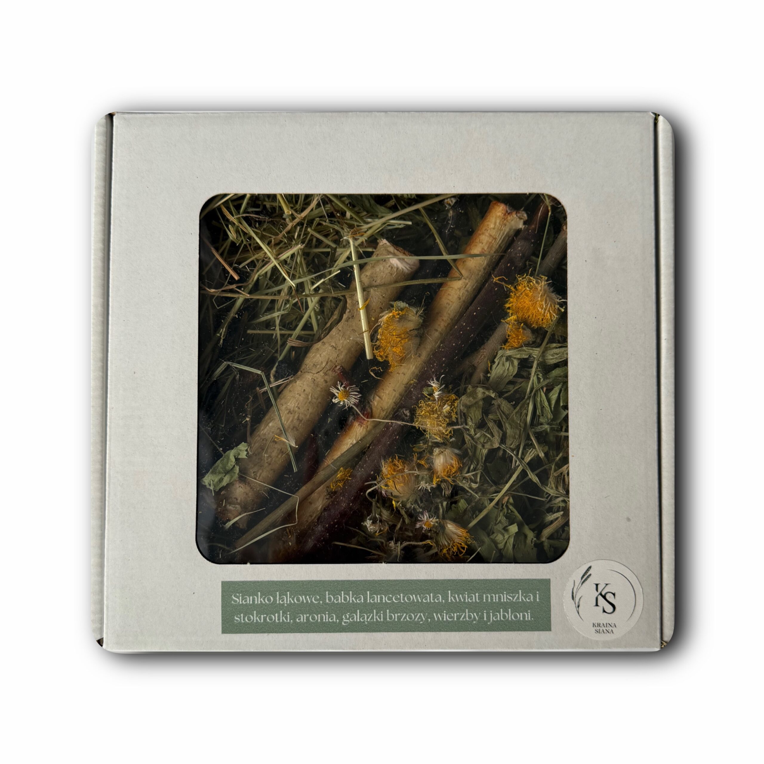 Zestaw dla królików i gryzoni z naturalnymi produktami: -siano łąkowe z tymotką -babka lancetowata -kwiat mniszka lekarskiego i stokrotki -aronia -gałązki brzozy, jabłoni i wierzby